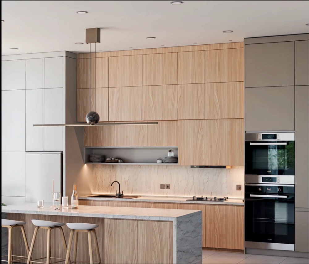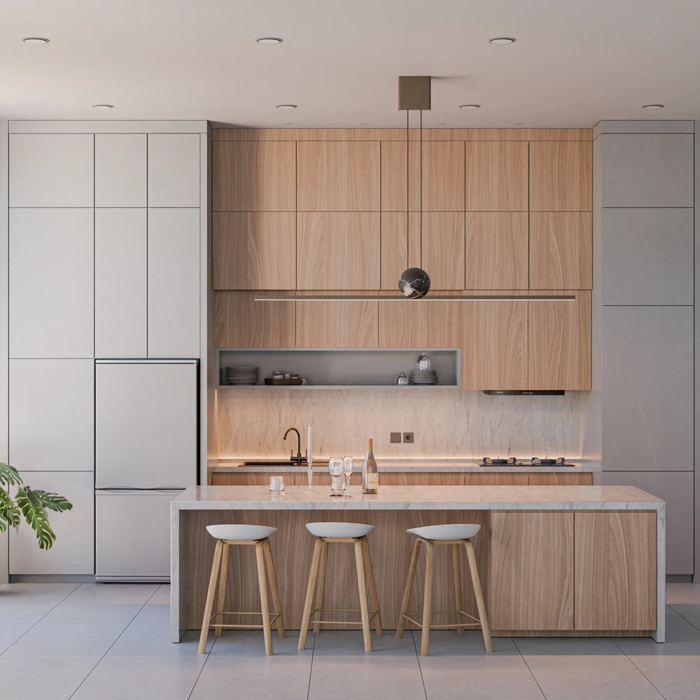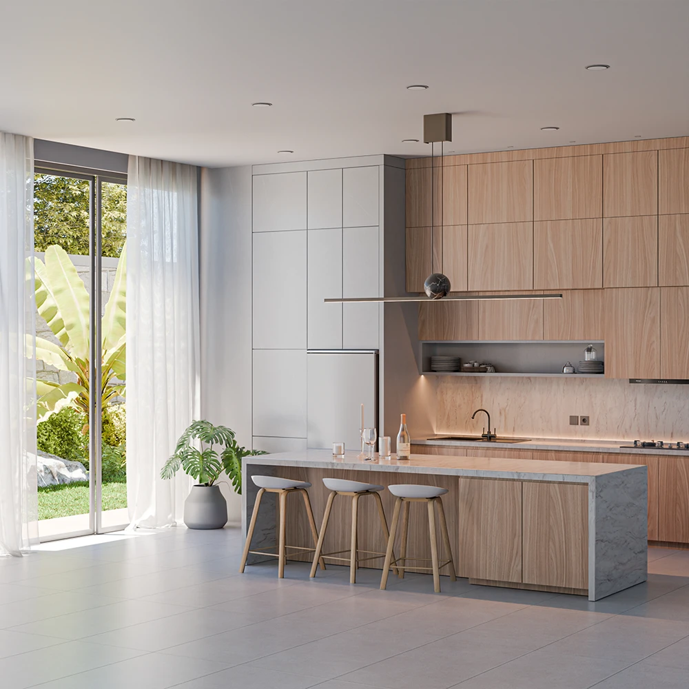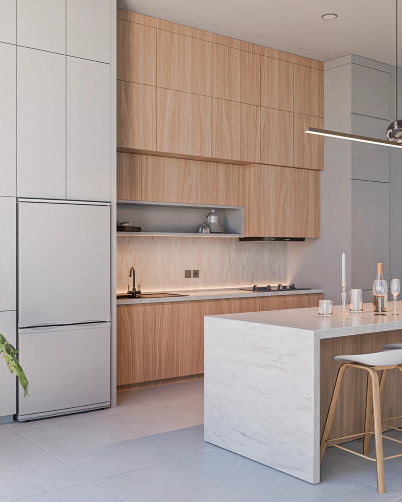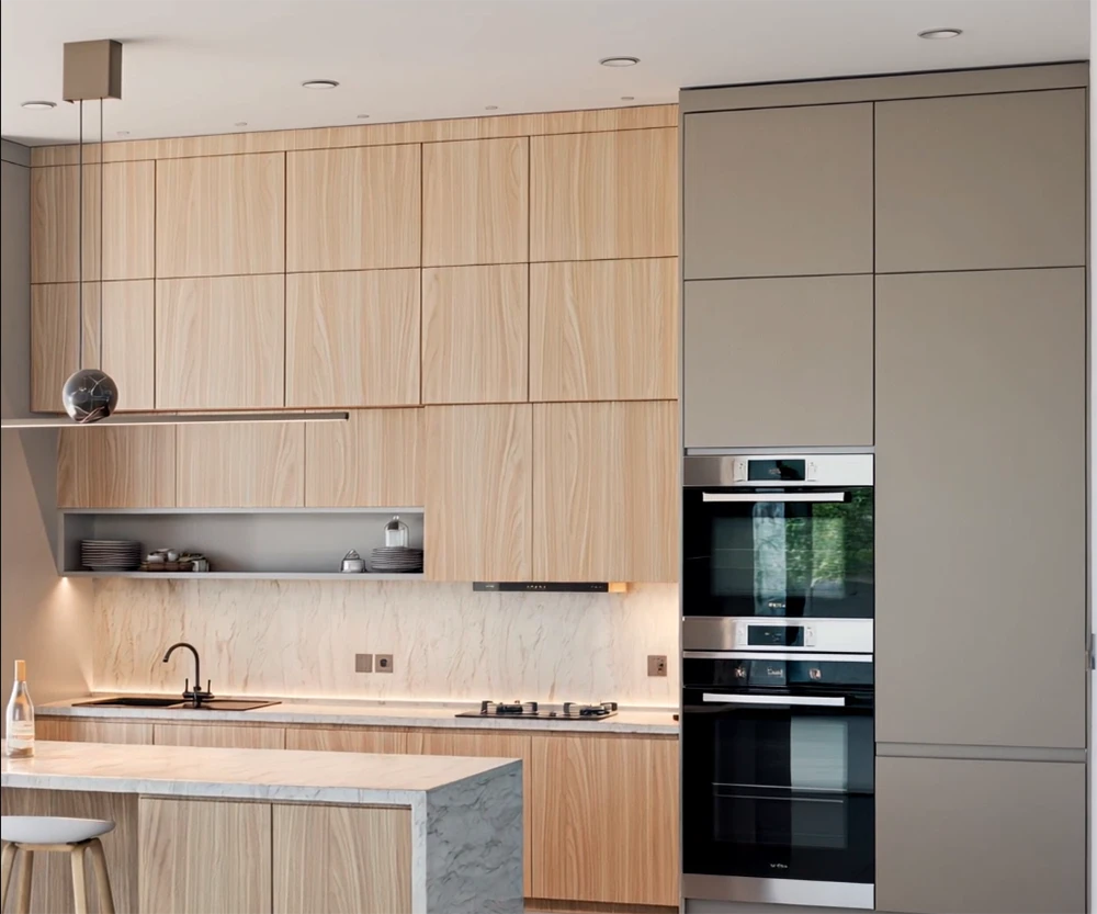• החבאת פונקציה מבלי לוותר על נוחות: המקרר והארונות הגבוהים משתלבים בקיר אינטגרלי בגימור מט, כך שהעיצוב נשמר נקי.
